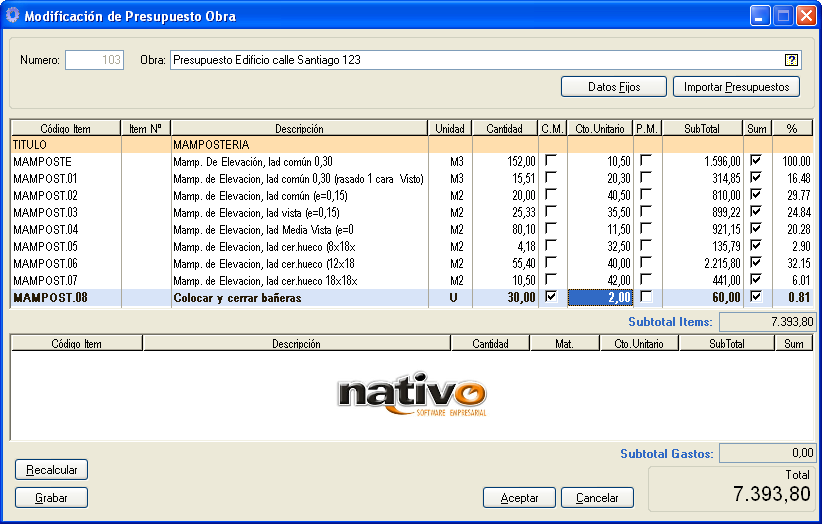 Nativo Building es un modulo complementario de NATIVO Pymes que esta orientado resolver los aspectos tecnicos de la construccion, tanto civil como vial- Resuelve la problematica de la presupuestacion, costeo, lanzamiento de la obra, prevision de abastecimientos de materiales y recursos, seguimiento de los items de la misma a traves del diagrama de Gantt que nos permite graficar la programacion de los items y el seguimiento de la ejecucion y el rendimiento de los mismos,