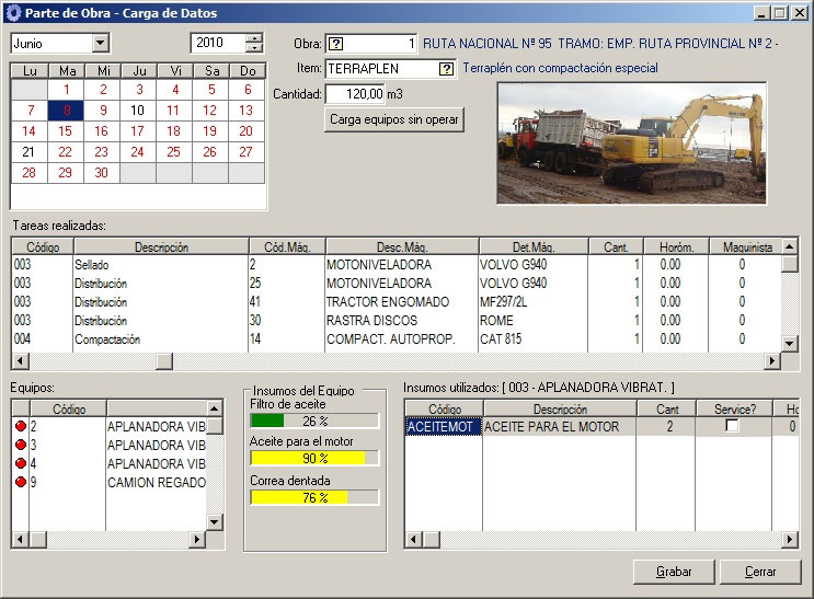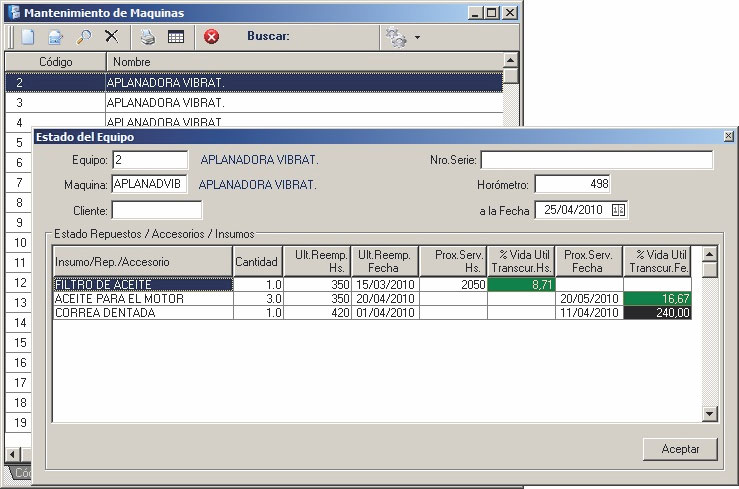 Ademas, en cada equipo que participe en una tarea del item informado, el sistema controlara el estado del mantenimiento preventivo del mismo (cambio de aceite, filtros, etc) informando al operador la aproximacion de la fecha de un reemplazo programado para que este avise a los encargados del mantenimiento de los equipos.
