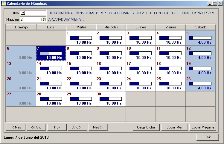 Con el fin de definir el periodo en dias de cada tarea, el sistema cuenta con un CALENDARIO GENERAL DE OBRA donde se carga la cantidad de hora que se trabajara cada dia de la semana, de manera de definir en este la cantidad de horas de trabajo por dia, dia a dia. Este calendario me permite establecer cuantos dias estara ocupado cada equipo de manera de poder saber en que momento podre liberarlo para destinarlo a otra obra. De existir equipos que trabajen en distinto horario, se creara un calendario propio para dichos equipos.