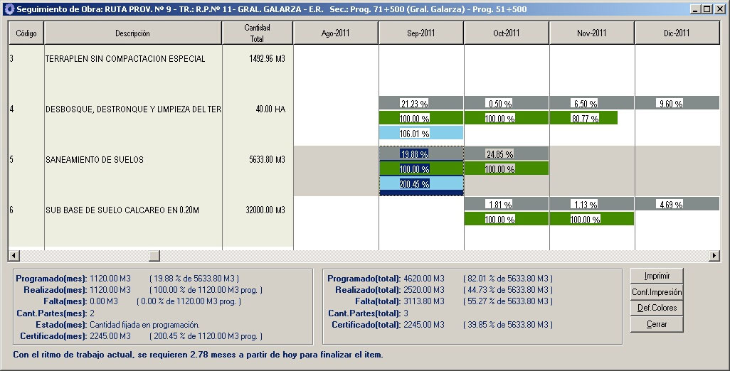 A medida que van ingresando los partes de obra va cargando dia a dia en la barra que se encuentra por debajo de esta, que representa la cantidad del item ejecutado. Esto me permite tener una exacta idea en cada item en que estado de cumplimiento porcentual me encuentro y puede graficamente identificar a aquellos que no van avanzando al ritmo establecido previamente en la programacion del mismo en funcion de los colores en que se representa la barra de lo ejecutado (Verde: rendimiento mayor al 95% de los standards establecidos. Amarillo: entre el 95 y el 75%. Rojo: por debajo del 75% de rendimiento en la tarea).