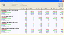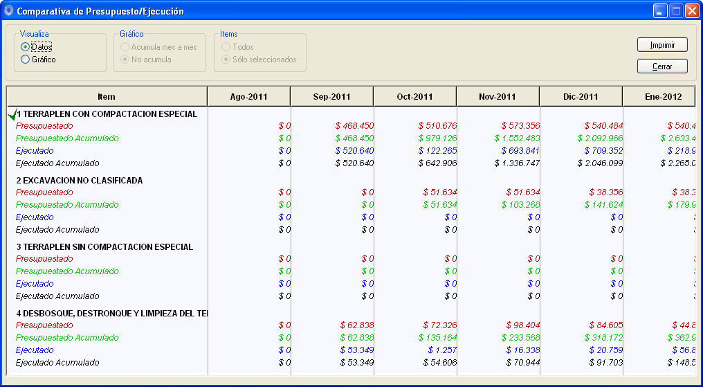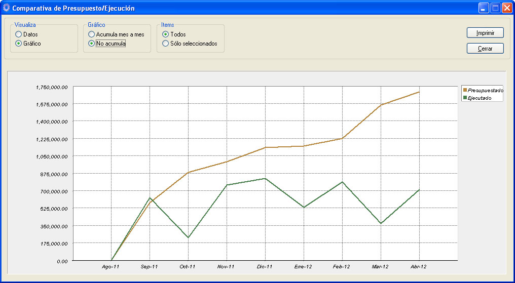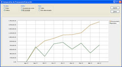 También se puede optar por la visualización gráfica de los datos. De esta forma se observan dos curvas en el tiempo que representan los costos presupuestados y ejecutados respectivamente. Es posible indicar que las curvas representen los costos mensuales o bien los costos acumulados, y que sólo se incluyan para el gráfico los costos de los items que previamente fueron seleccionados en la disposición tabular de la información.