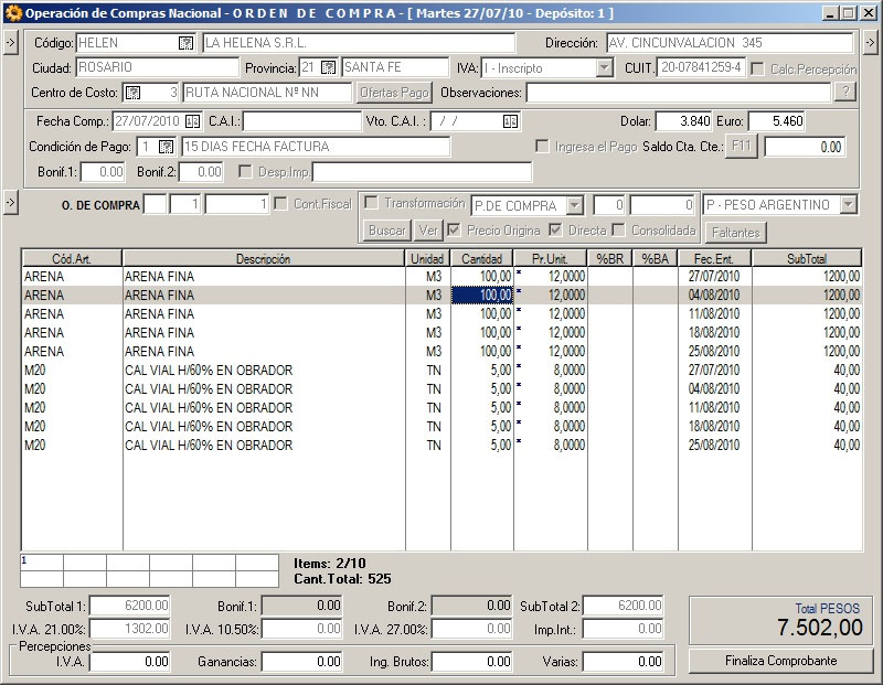 Cada uno de esos estados estara guardado y se administrara desde el archivo correspondiente, de manera que se vayan eliminando de cada archivo a medida que se ejecuten los distintos procesos de la de compra y se vayan cargando en los siguientes, de manera de poder seguir a traves de estas etapas el abastecimiento general de la obra. Dichas ordenes de compra se iran cancelando a medida que ingrese a la obra cada remito entrega parcial y se vaya cumpliendo con las cantidades solicitadas de cada insumo manteniendose en todo momento el estado de deuda de cada proveedor y la estadistica de cumplimiento del mismo a los fines de su categorizacion futura.