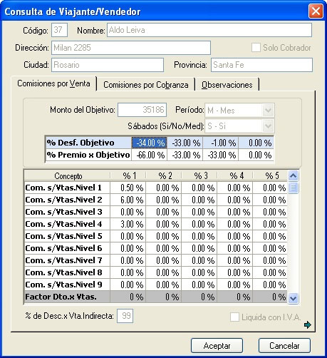 Comisiones de viajantes o vendedores, selectiva por tipo de artículo o por descuentos, por venta y/o por cobranza, con premio por objetivos y descuento por atraso en la cobranza o bonificaciones en la venta. Liquidación del I.V.A. ventas incluyendo las retenciones de dicho impuesto. Listado de ventas por provincia p/liquidación de Convenio Multilateral.