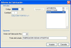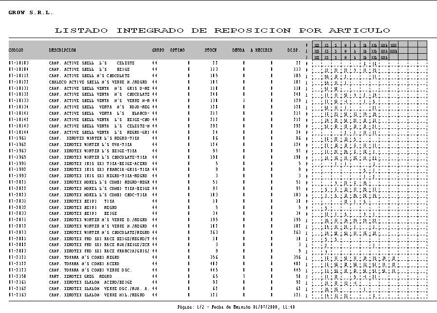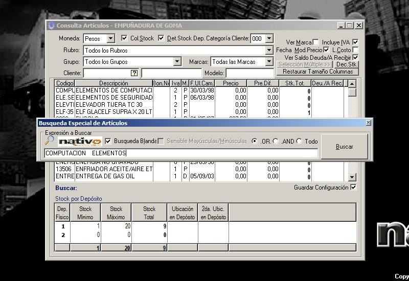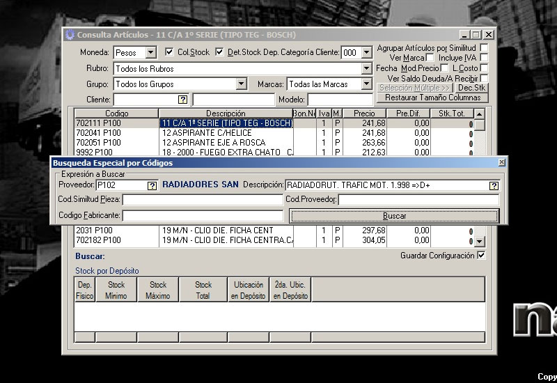 Estas búsquedas son parametrizables por el usuario, el cual puede decidir que quiere ver en la pantalla de consulta (código, descripción, precio normal, precio especial, con iva o sin iva, fecha de cambio de precio, costo, fecha de cambio de costo, stock separado por deposito o no, deuda por notas de venta o por ordenes de compra, marca, modelo, etc.). Además se le puede pedir que muestre los articulo agrupados por similitud de manera que me muestre juntos todos los artículos que cumplen una misma función. O por código de fabricación para el caso de repuestos.