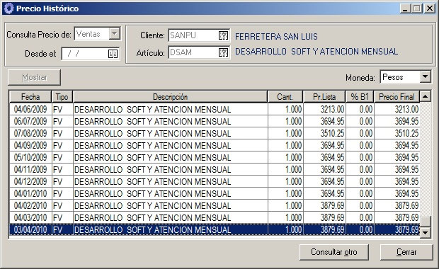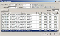 Consulta por pantalla de comprobantes ya emitidos y posibilidad de consultar, en línea con la facturación, el precio histórico de cada artículo con c/cliente, con el detalle de las operaciones efectuadas.