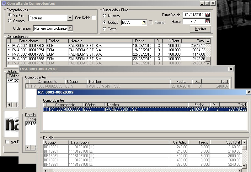 Como búsqueda complementaria en el momento de definir una operación cuenta también con un modulo de consulta on line de comprobantes anteriores donde puedo buscar presupuestos, notas de venta, facturas, recibos, etc. anteriores de un cliente o proveedor con posibilidad de ver todos los componentes de c/comprobante analizado (mercadería involucrada, precios, bonificaciones, descuentos, fecha, operador, cotizaciones de monedas, etc. ) con la posibilidad, además, de ver la trazabilidad de dichos comprobantes. Es decir, si lo que estoy analizando es una factura, desplegar los remitos que la originaron.