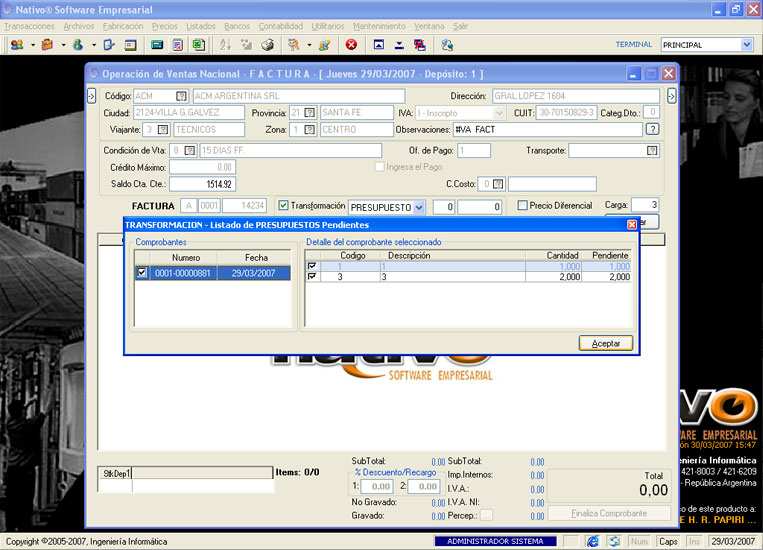 Metodología de Transformación de Comprobantes que permite, registrando únicamente el comprobante primitivo de una operación (presupuesto o nota de venta), ir transformándolo automáticamente, sin tener que volver a digitarlo, en los comprobantes derivados (remito y/o factura), ahorrando tiempo operativo, eliminando la posibilidad de errores y posibilitando la trazabilidad de las operaciones.