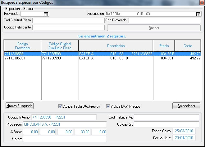 A través de la tecla F3 se accede a una consulta especial con la cual los artículos pueden ser buscados por código, descripción, proveedor, código de proveedor, cod. de similitud, de referencia, o de fabricación, de manera de filtrar y mostrar todos los artículos que cumplan con los requisitos mas sus equivalentes, para poder hacer comparativas de precios y stocks de las distintas alternativas a ofrecerle al cliente.
