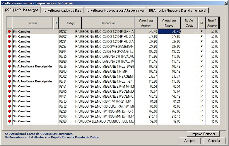 Si lo encuentra actualiza el costo. Si no lo encuentra lo busca entre los dados de baja. Si lo encuentra dado de baja sigue con el 2 articulo del archivo del proveedor. Si no lo encuentra es porque es un articulo nuevo en la lista de mi proveedor y me lo pone en la solapa de “artículos con alta transitoria” de manera que al terminar la importación yo pueda decidir si los doy de alta en mi archivo de artículos o directamente lo paso a artículos dados de baja. Al terminar el proceso de cambio de costos (que se efectúa en memoria) el sistema me muestra de los artículos a cambiar el costo anterior, el actual y el porcentaje de variación. Una vez que reviso ese informe estoy en condiciones de procesar la información total o parcialmente. Este sistema me permite tener en mi archivo exclusivamente los artículos que trabajo de cada proveedor y no todos los que el vende y yo no comercializo.