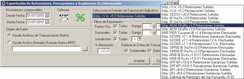 Exportación automática de las percepciones y retenciones sufridas y generadas directamente a los distintos aplicativos de la AFIP. Posibilidad de mandar el archivo por mail al estudio contable para que allí se genere la declaración correspondiente.