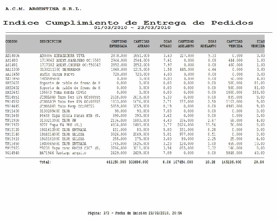 Control estadístico del cumplimiento en las entregas tanto hacia nuestros cliente como desde nuestros proveedores. determinación exacta de la cantidad de días de atraso (o adelanto) de los productos entregados o vencidos a entregar. análisis por general, por articulo o por cliente. Detalle de cada remisión para cada pedido a través de la trazabilidad de comprobantes. determinación de un índice de general de entregas con el fin del seguimiento de dicho valor luego de aplicar políticas correctivas.