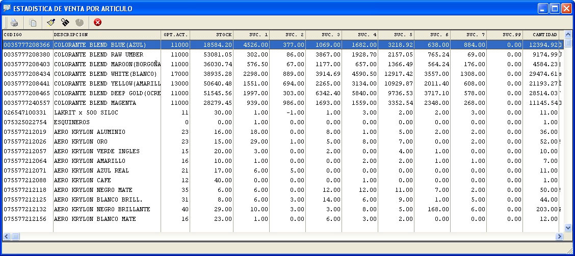 Consulta on line de artículos que puede ser invocada desde cualquier punto del sistema con la tecla de función F5, conteniendo toda la información necesaria tanto para asistir la gestión de ventas en forma rápida como así también la de compra, con la posibilidad de contener información de código, descripción, modelo, marca, precios comunes y especiales, nivel de IVA, stock clasificado por deposito, fecha de cambio de precio y/o de costo, deuda.
