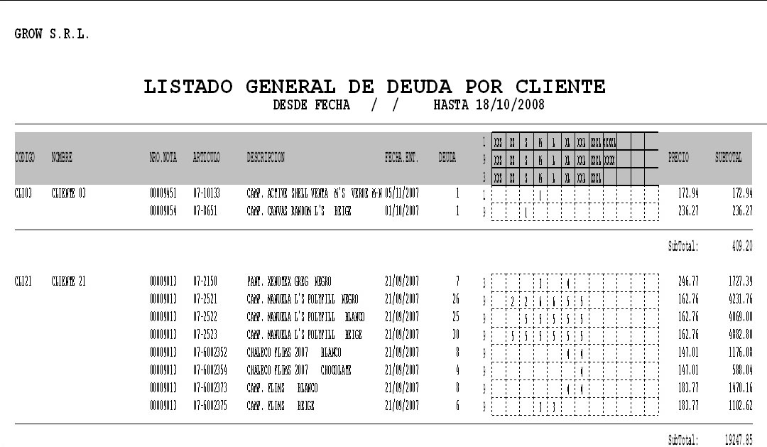 Listado de deuda de mercadería a remitir, por cliente, por artículo o por fecha.
