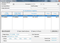 A través de la tecla F3 se accede a una consulta especial con la cual los artículos pueden ser buscados por código, descripción, proveedor, código de proveedor, cod. de similitud, de referencia, o de fabricación, de manera de filtrar y mostrar todos los artículos que cumplan con los requisitos mas sus equivalentes, para poder hacer comparativas de precios y stocks de las distintas alternativas a ofrecerle al cliente.