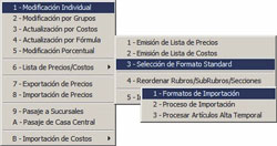 Si lo encuentra actualiza el costo. Si no lo encuentra lo busca entre los dados de baja. Si lo encuentra dado de baja sigue con el 2 articulo del archivo del proveedor. Si no lo encuentra es porque es un articulo nuevo en la lista de mi proveedor y me lo pone en la solapa de “artículos con alta transitoria” de manera que al terminar la importación yo pueda decidir si los doy de alta en mi archivo de artículos o directamente lo paso a artículos dados de baja. Al terminar el proceso de cambio de costos (que se efectúa en memoria) el sistema me muestra de los artículos a cambiar el costo anterior, el actual y el porcentaje de variación. Una vez que reviso ese informe estoy en condiciones de procesar la información total o parcialmente. Este sistema me permite tener en mi archivo exclusivamente los artículos que trabajo de cada proveedor y no todos los que el vende y yo no comercializo.